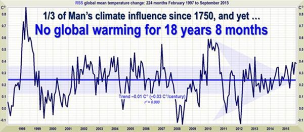 Oktober har ankommet og vi har temperaturdata for september måned. Globalt satellittmålt temperaturavvik fra gjennomsnittlig temperatur (TLT) for september måned bekrefter at pausen i global oppvarming lever i beste velgående. UAH bruker for femte måned versjon 6.0 av sitt datasett. Som vanlig ser vi bort ifra landbaserte målinger av temperatur som er forurenset av urbane varmeøyer og dermed er mer upålitelige enn satellittmålt temperatur. TLT-dataene er fra lavere Troposfære.