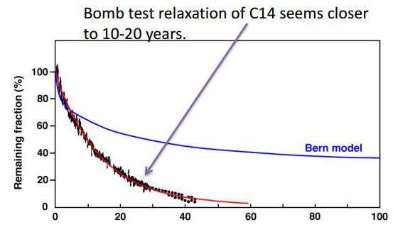 Det er simpelthen umulig å argumentere for at plantematen CO2 er en trussel mot menneskeheten hvis man ikke kan få det til å akkumulere seg i atmosfæren i truende mengder over lang tid, derfor er det nødvendig å mene at et CO2-molekyl oppholder seg hundre eller hundrevis av år i atmosfæren, helt uavhengig av det pinlige faktum at gjennomsnittsmolekylet bare oppholder seg i atmosfæren i ca 5,4 år som Segalstad påpeker. Figuren til venstre som er fra prof.Lindzens foredrag i Oslo viser klart at C14-isotopen har en vesentlig kortere levetid i atmosfæren enn det IPCC’s Bernmodell opererer med. Beregner man atmosfæren med en tankreaktor med røring finner man rundt 5 år i de viktige deler av atmosfæren i tråd med figuren.