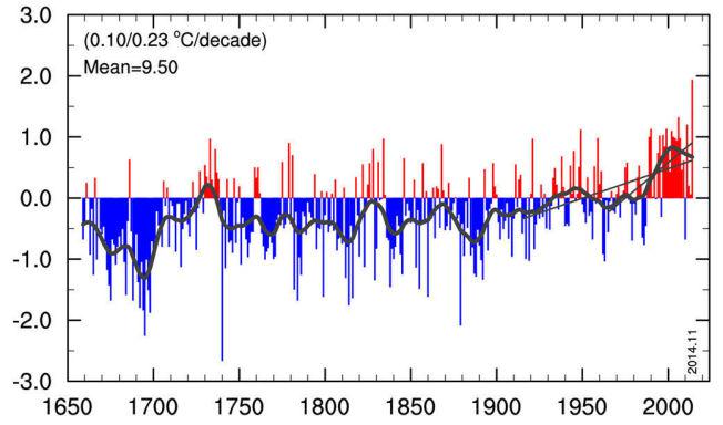 Fra 1695 til 2014 har det i Sør-England vært en temperaturendring på ca 2.1 C som gir en endring på 0,7 pr århundre, mens endringen siste århundre siden 1914 kan vi se er omtrent, nettopp 0,7 grader. Nullpunktet avgjør så meget. På starten fra 1695 virket det riktignok som det skulle bli 3,5 C pr århundre, men det roet seg kraftig ved en temperaturnedgang, men nivået fra 1695 er aldri nådd over lengre tid siden som man kan se selv om 1740 må ha vært det kaldeste året som noensinne er målt, mens årene rett før hadde nesten like høy temperatur som i dag.