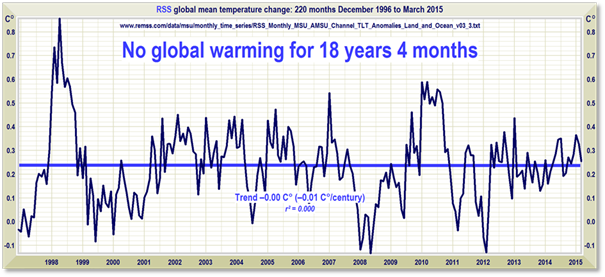 Ifølge figuren til venstre over satelittmålt temperatur fra RSS som måler mer pålitelig enn HadCRUT4 og mer systematisk i en atmosfærisk søyle, fant opphøret av oppvarmingen sted for 18 år og 4 måneder siden.