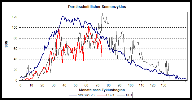 Observerte solflekker (SSN) var bare 44.8, kun 53% av gjennomsnittet for denne måneden i solsyklusen – basert på kalkulasjon av observasjoner fra tidligere solsykluser. Figuren til venstre viser inneværende syklus 24 i rødt, gjennomsnitt for alle tidligere observerte sykluser i blått, og syklus nr 1 i sort – dette er den til nå mest like syklusen av de 23 foregående.