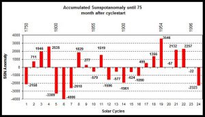 Verdiene her er akkumulerte avvik i solflekkantall for hver syklus i syklusens første 75 måneder. Som i ser av første figur har vi 5 år til foran oss med et synkende antall solflekker før neste solsyklus starter etter 2020. Man trenger ikke være solforsker for å skjønne at det går mot et par kjøligere tiår i tiden som kommer.