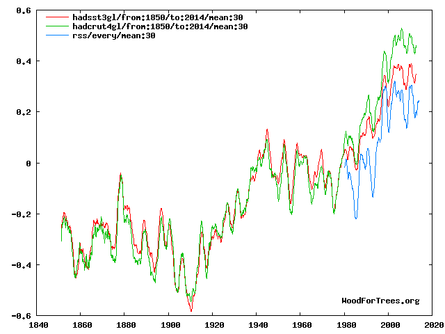 Tidsserier for temperatur i havet og i atmosfæren viser havets betydning, se figur 1 til venstre hvor rød kurve er havtemperatur i overflaten (HADSST3). Grønn kurve er global temperatur ved jordoverflaten (HADCRUT4). Blå kurve er temperatur i nedre Troposfære målt fra satellitt (RSS)