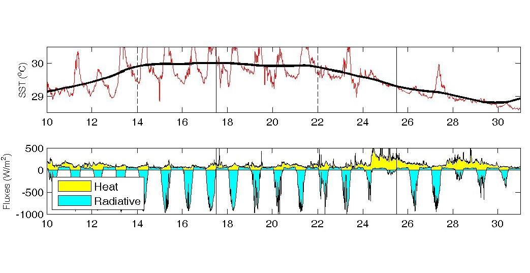 Nederst viser cyan kurve innkommende daglig reell solinnstråling (”radiative” negative verdier) som lagres i de øverste 200 m i havet. Gul kurve (positive verdier) er latent varmestrøm (varmetap som avdamping) fra havet som kjøler havet, og varmer opp luften. Øverst vises hvordan sjøtemperaturen påvirkes av netto energistrøm, daglig og midlet. I perioden 24 til 26 har det vært lite solinnstråling, mest sannsynlig på grunn av skyer, og stort varmetap, muligens på grunn av sterk vind. Klart eksempel på at endring i havet påvirker temperatur.