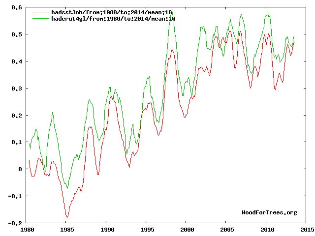 Vi ser at rød og grønn kurve skiller lag etter 1980 i figur 1 ovenfor, hva betyr det? Havtemperatur og global temperatur følger ikke lengre hverandre, men havet er istedet blitt kjøligere. La oss se på den nordlige halvkule for perioden 1980 til 2015: