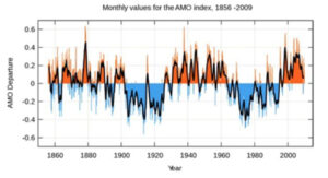 Havstrømmer drives av vinder, har stor treghet og vekselvirker energi og fuktighet med lufta. Golfstrømmen har varmeimpulser, den multidekadiske oscillasjon (AMO). Under et maksimum i 1944 var temperaturen utenfor Skottland 2.2 C høyere enn i 1915. AMO har også en 60-70 års syklus, men er forskjøvet 15 – 20 år i forhold til NAO (Figur. Varm fase frem til i dag, NOAA).