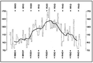 NAO varierer i kortere og lengre perioder i sesongen, på årsbasis og syklisk over 60-70 år. Klimaguruen Hubert Lamb registrerte vindretninger i Europa. En oppbygging av positiv NAO fra 1900 ga gradvis mer vestavind til en topp rundt 1925, deretter gradvis reduksjon (Figur). Dette ga også økt nedbør i vestlige Russland med økt vannstand i Neva-elven fra Ladoga.