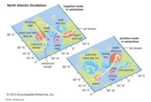 Været rundt Nord-Atlanteren domineres, spesielt om vinteren, av den Nord-Atlantiske Oscillasjonen, NAO, en velkjent, naturlig svingning mellom kalde og varme faser som kan variere innen en sesong, holde seg over flere år og med en 60-70 år syklus som er sporet langt tilbake i tid og uten sammenheng med CO2.