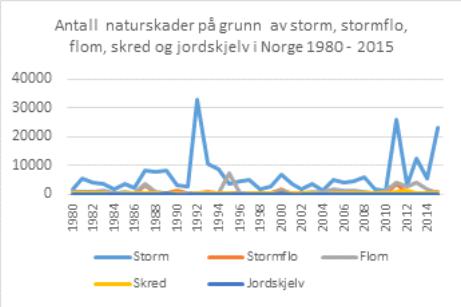 Figur 2 viser utviklingen av ulike typer naturskader fra 1980 til 2015. 77, 3% av alle naturskader skyldes storm, deretter 14,3% flom, 5,5% stormflo, 2,5% skred og 0,3% jordskjelv. Det sees også her at stormen, Nyttårsorkanen i 1992, har vært den dominerende hendelsen. Flommen i Glomma våren 1995 var ekstrem. Den ble kalt Vesleofsen. Noen ganger oppstår det ekstreme naturkatastrofer. Det betyr nødvendigvis ikke at det er klimaendringene som har skylden.