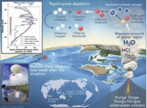 Ser vi nøyere på kurven ovenfor, er det en svært rask temperaturstigning, som ikke kan skyldes CO2, som stiger svært langsomt. Det er heller ikke en El Nino-effekt som forsvinner i løpet av noen måneder. I det følgene skal vi presentere en hypotese (2) om at dette skyldes store mengeder vanndamp som er pumpet opp i stratosfæren fra et undersjøisk vulkanubrudd fra Hunga Tonga vulkanen langt vest i Stillehavet. Det er estimert at utbruddet sendte 146 millioner tonn vann opp til 31 kilometers høyde i stratosfæren.
