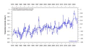 Beregninger av jordas globale temperatur basert på satellittmålinger fra 1979 regnes som de mest presise. Figuren ovenfor (1) viser beregnet temperatur for nedre atmosfære til og med oktober 2025. Vi ser noen kraftige kortvarige økninger i 1998, 2010 og 2016. Dette skyldes kraftige El Nino-fenomen i Stillehavet. Disse hendelsene er kortvarige, og temperaturen faller raskt til sitt tidligere nivå. I 2022-24 ble det observert en ny topp, og media påstod at dette var de varmeste år noensinne – på grunn av CO2-utslipp.