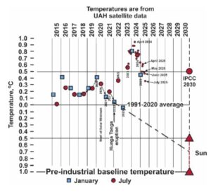 Figuren nedenfor viser global temperatur i januar (blått) og juli (rødt). Den var på vei ned fra 2019 på grunn av svakere sol. Forfatterne konkluderer at når vanndampen er borte fra stratosfæren i 2030 blir det merkbart kaldere, mens IPCC og våre myndigheter hevder at det blir stadig varmere. Svaret vil vise seg om få år …