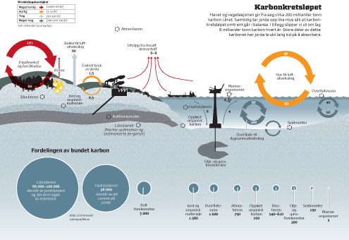 «Havet og vegetasjonen gir fra seg cirka 200 milliarder tonn karbon i året. Samtidig tar jorda opp like mye slik at karbonkretsløpet omtrent går i balanse. I tillegg slipper vi ut om lag 8 milliarder tonn karbon hvert år. Store deler av dette karbonet har jorda brukt lang tid på å absorbere.»