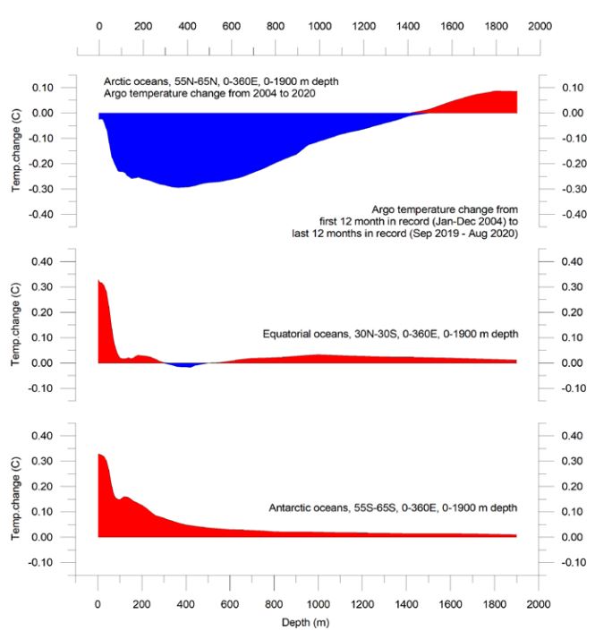 Havtemperatur: Argo Programmet, som bruker robotbøyer for å registrere havtemperatur har nå gitt data for 15 år, ned til 1900 meters dybde, Dette er et relativt kort tidsrom, men observasjonene blir stadig mer interessante. Siden 2004 har havenes øvre 1900m opplevd en netto oppvarming på ca. 0.07°C. Detaljene gir mer innsikt enn gjennomsnittet. Maksimal netto oppvarming er ca 0.2°C, og virker på det øvre 100 meter i havene og for det meste nær ekvator, hvor solinnstrålingen er størst. Samtidig har havene i nord (55–65°N) i gjennomsnitt opplevd en markant nedkjøling ned til 1400m.