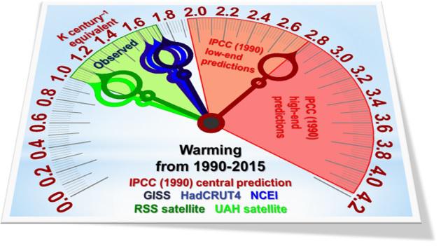 Men de blå viserne som representerer oppvarmingen rapportert av de tre endrede datasettene for bakketemperatur, viser litt mer enn det halve som oppvarming. De grønne viserne som representerer satellitt datasett, viser bare en tredjedel av hva FN hadde forutsagt med «betydelig tillit » i 1990.