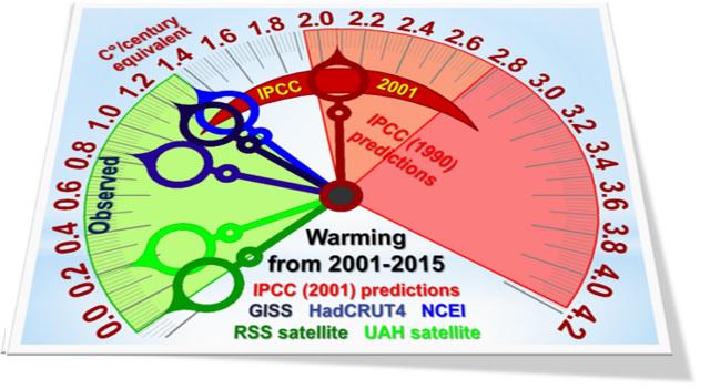 Fig2_MSLDenne oppdaterte temperaturklokken viser oppvarm-ingen FNs klimapanel spådde i sin 2001 Third Assess-ment Report, sammenlignet med målt oppvarming fra da til 2015. Raten i målt oppvarming, representert ved den grønne sonen, er åpenbart mindre enn raten for oppvarming siden 1990, selv om CO2-konsentrasjonen har økt i hele perioden.