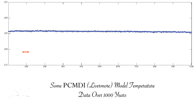 Feil skyldes også at forskerne må gjette seg til fysiske sammenhenger som ikke er kjente. For eksempel er det store usikkerheter vedrørende hvor mye temperaturen vil øke som følge av økning av CO2 og andre klimagasser. Det er enkelt å beregne hvor mye stråling som stoppes med økt CO2 mengde. Men mye av varmen transporteres ved luft som beveger seg og vanndamp som kondenseres og fryser. Vi har ligninger som styrer luft og vanns bevegelser, de såkalte Navier-Stokes ligninger. Til nå er det ikke funnet en eksakt løsning. Det er utlovet en belønning på $1 000 000 til den som finner en løsning. Beregninger som gjøres krever tilnærminger og gjetning på sammenhenger. De er kompliserte og ustabile. Essex har utviklet metoder for å gjøre slike beregninger stabile, men det fører til at naturlige variasjoner forsvinner. Et eksempel på en tusen års modellkjøring er vist i figur ovenfor til venstre (flat temperatur).