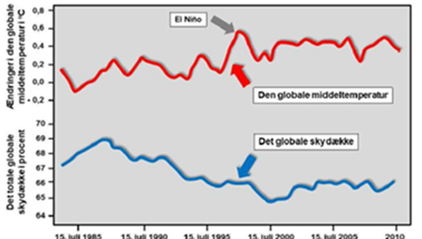 Derfor fokuserer Clauser på effekten fra endringer i skydekke som han hevder er klodens termostat, opp til 10 ganger kraftigere enn direkte effekter fra endringer i drivhusgasser. Figuren under viser en klar sammenheng mellom temperatur i rødt og endringer i skydekke (blått) fra oppvarmingsperioden 1984 – 2000 og den videre pausen til 2015. Mønsteret følges også i de etterfølgende år.