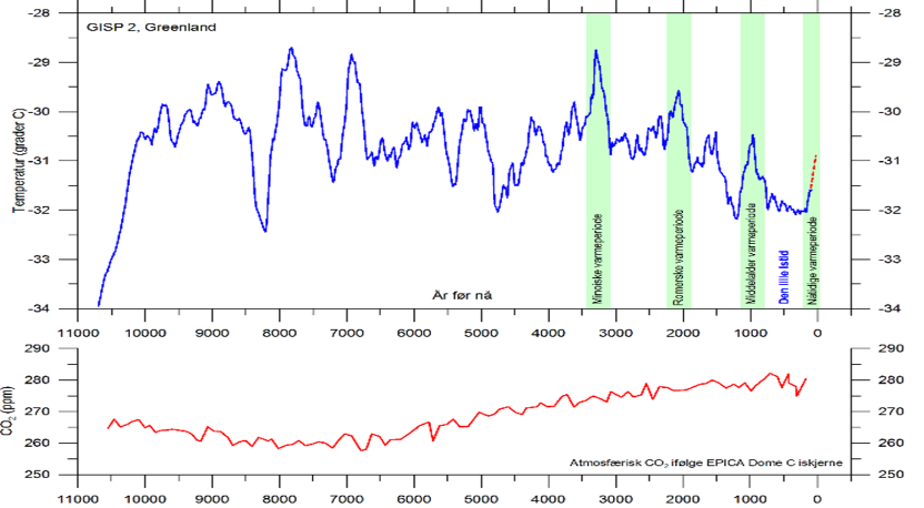 Endringene i CO2 (iskjernemålinger) er små og varierer motsatt av temperatur. Varmeperiodene gir seg utslag også i Norges isbreer som var helt fraværende for 4 000-8 000 år siden da landet var 4-5 grader C varmere og furuskogen dominerte høyfjellsviddene. Ingen klimakrise, varmeperiodene var tvert imot sterkt utviklende for datidens samfunn direkte avhengig av hva naturen bød på med få muligheter for teknologiske tiltak. Ingen klimakrise da heller med et 4 grader C varmere hav utenfor Norge.