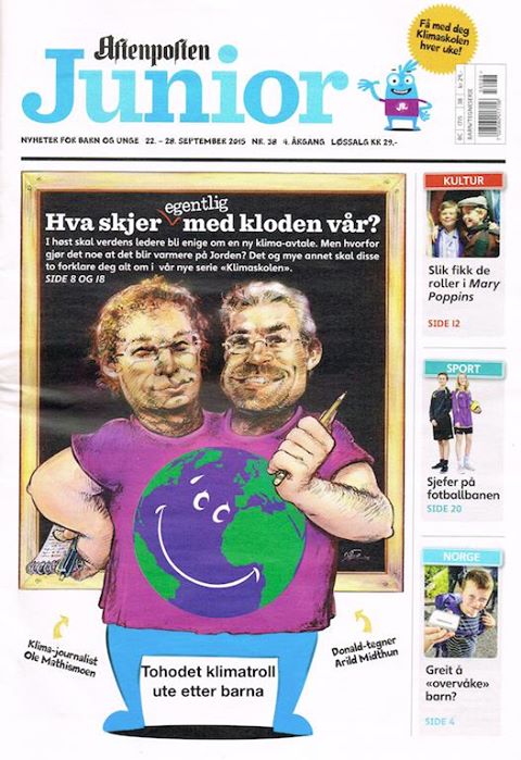 3. Aftenposten Junior har startet Klimaskolen. Det blir 1 side med indoktrinering i hvert nummer fra og med 22. september. Bladet er beregnet på aldersgruppen 8 – 12 år.