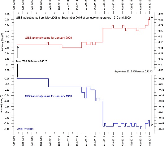 Følgende illustrajon viser hvordan NASA-Giss over tid og i ettertid har justert historiske temperaturer og dermed har greidd å administere seg til en menneskeskapt klimaendring i form av økende globale temperaturer.