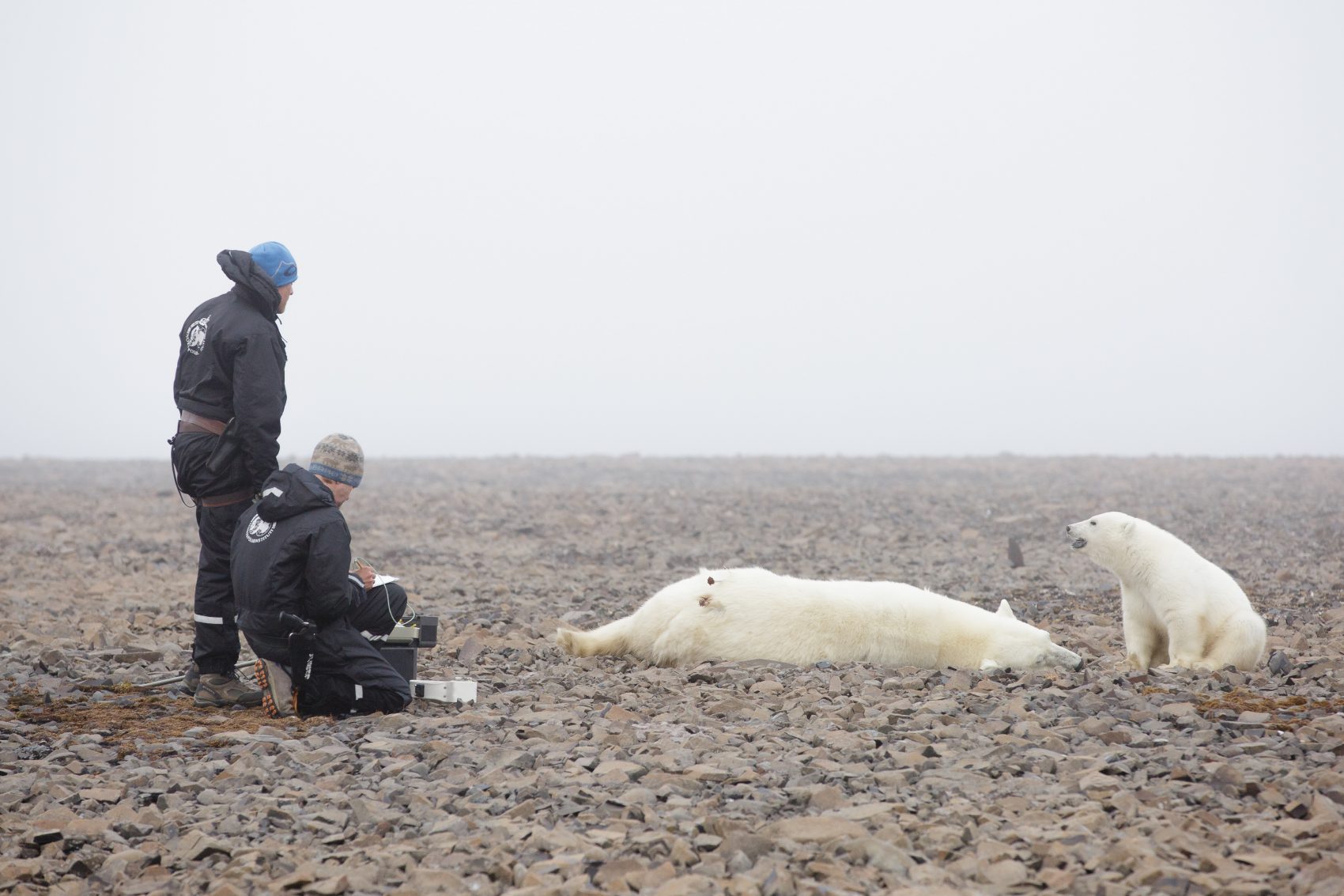 Magnus Anderson and Jon Aars observe a female polar bear and her cub waiting for the tranquilliser to have its full effect so that they can start work taking samples from the bear safely.