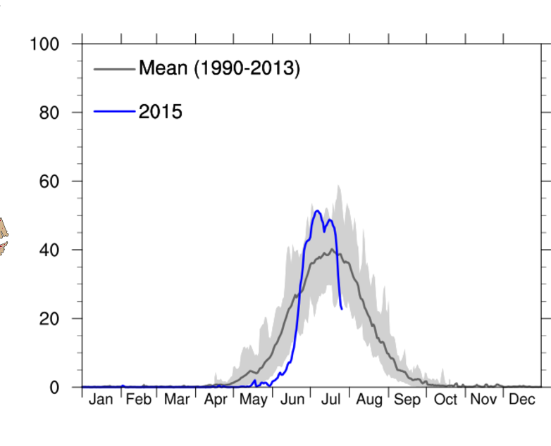 Det er ingen sammenheng mellom mengden av smeltet is og det tidspunktet smeltesesongen starter. Da er det mer interessant å se hva den blå kurven finner på å gjøre de neste 35 dagene men dette ser mer og mer ut som et svært bedrøvelig år for klimaskremmerne.