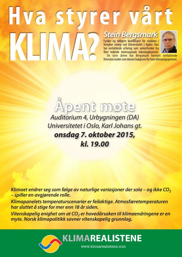 Stein Bergsmark er kveldens foredragsholder, han var inntil nylig studiekoordinator, fysiker og Master i fornybar energi ved Agder Universitet. Han har etter omfattende studer over flere år produsert en lengre klimarapport med tittel: Vårt klima – en realitetsorientering som du nå kan få servert essensen fra i et kort og lettfattelig foredrag!