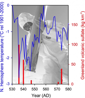 På figuren ser man hvordan vulkanutbruddene i 536 og 540 e. Kr. påvirker temperaturen i henhold til iskjerneprøvene fra Grønland. Også påfølgende utbrudd i 626 og 939 e. Kr assosieres med brått synkende temperaturer.