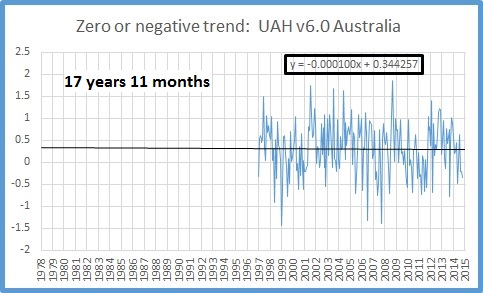 Som man ser av figuren har det ikke vært noen signifikant oppvarming i Australia på 17 år og 11 måneder.