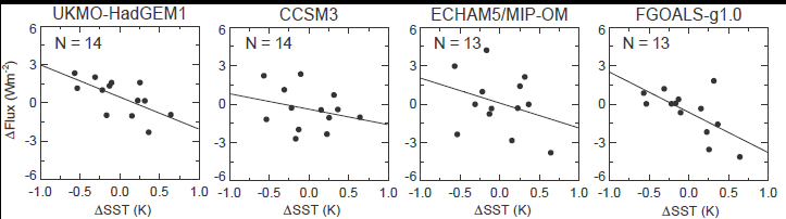 Et eksempel er at alle klimamodeller viser at det blir mindre stråling ut av atmosfæren når temperaturen ved havoverflaten øker (Se figur til venstre, og klikk på den for å se hele bildet). Dvs. at varme holdes tilbake, drivhuseffekten forsterkes (positiv tilbakekopling). Eksemplene fra 4 slike modeller er vist med utstråling i W/m2 som funksjon av variasjon i temperatur ved havoverflaten. Her ser vi at modellene har alle kurver som går nedover – modellenes påstand er at det blir mindre stråling ut av atmosfæren med varmere havoverflate.