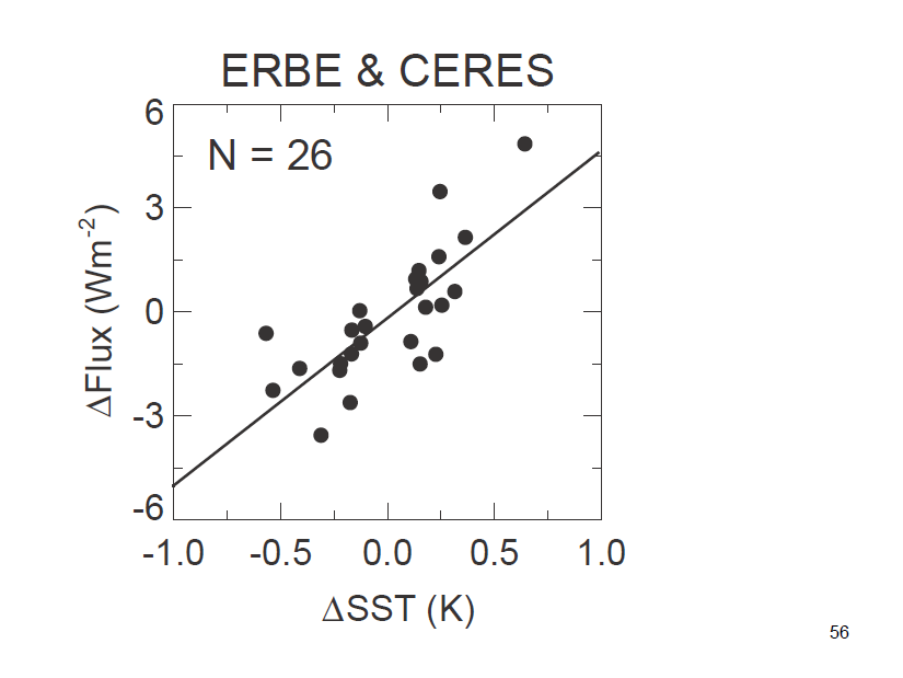 At alle modellene viser det samme, gjør at IPCC kaller dem for “robuste” – noe vi kan stole på. Imidlertid observerer vi med satellittmålinger (ERBE & CERES i figur 2 til venstre) det motsatte. Vi ser at kurven går oppover: det betyr at mer stråling går ut av atmosfæren når havoverflaten er varmere. Dette viser en negativ tilbakekopling, drivhuseffekten blir altså redusert. Ut fra disse observasjonene beregnes en klimafølsomhet på 0,66-0,87°C. Dvs. at en dobling av CO2 fører til mindre enn 0,9°C oppvarming.