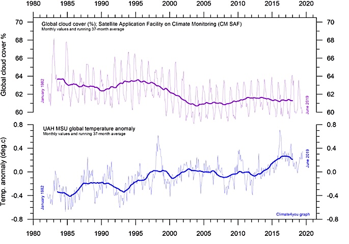 Sammenheng mellom skydekke og temperatur Med et globalt midlere skydekke på rundt 67 prosent blir effekten av observerte variasjoner på 3 prosent vesentlig større enn bidrag fra variasjoner i drivhusgassene. Figuren under viser øverst redusert globalt skydekke (Satellite Application Facility on Climate Monitoring), mens temperaturen (UAH-satellitt) stiger i nedre troposfære (Climate4you). [Figuren viser at når skydekket over tid minker, så stiger temperaturen over tid. Merknad red.]