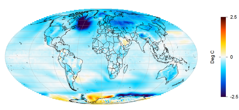 Hos Bishop Hill har de funnet en forskningsrapport (Chandler Et Al 2013) som ser på klimamodellen GISS-E2-R  fra NASA-GIss som er benyttet av Marvel Et Al. Omtale også her på Climate Audit. Noe går fryktelig galt med modellkjøring nr 1. Havstrømmen «Atlantic Meridional Overturning Circulation» (AMOC) kollapser rundt 1950 og kommer ikke igang igjen. Som vist på figuren her (Figure 4. LU run 1 surface temperature change from 1850–75 to 1976–2000 mean) ender de med et kjempeområde i blåsvart farge syd for Grønland med 3-5 graders nedkjøling.