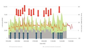 De siste 14 dagene har strømprisen svingt kraftig. Dette vil fortsette og forsterkes i fremtiden. Som grafen over viser, svingte strømprisen mellom 0 og 40 eurocent per kWh (grønt: fornybart, grått: gass og kull, rødt: strømpris). Den røde kurven viser tydelig nullpunktene (blå piler), der sol- og vindoperatørene subsidieres, og ekstremtidene (røde piler), der de som selger på spotmarkedet, tar ut enorme ekstraprofitter. Regningen betales av leietakere, bilister og industri gjennom CO₂-prisen og strømprisen.