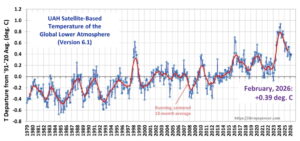 Den globale temperaturen steg litt i februar 2026. Den ligger nå 0,39 grader Celsius over det langsiktige gjennomsnittet. Avkjølingstrenden siden 2024 er fortsatt intakt.