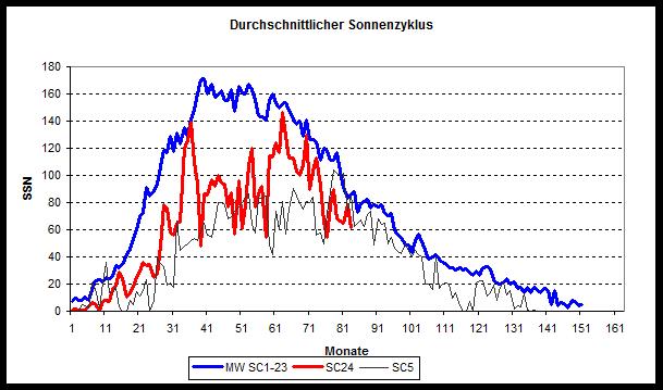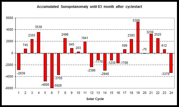 Nåværende syklus kommer til å bli en lang syklus siden den er så svak, syklus 5 varte i hele 12,6 år og omtrent det samme kan derfor forventes nå hvis sammenligningen med nr 5 holder seg. Anomaliene summerer seg til minus 3378.