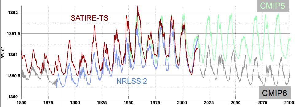 Nytt nå er at modellene slutter å forholde seg til en solaktivitet som til nå har vært konstant inni modellene, heretter skal det med at sola har et varierende pådriv, slik solforskningen alltid har insistert på. Figuren her viser pådrivet fra CMIP5-modellen i lysegrønt og det lavere pådrivet fra CMIP6 i grått.
