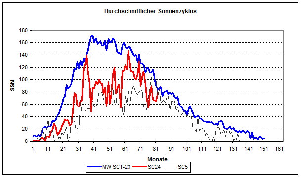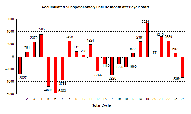 Nåværende syklus kommer til å bli en lang syklus siden den er så svak, syklus 5 varte i hele 12,6 år og omtrent det samme kan derfor forventes nå hvis sammenligningen med nr 5 holder seg. Anomaliene summerer seg til minus 3354 og vi kan trygt fastslå allerede nå at nåværende syklus er den svakeste siden Dalton-minimumet..