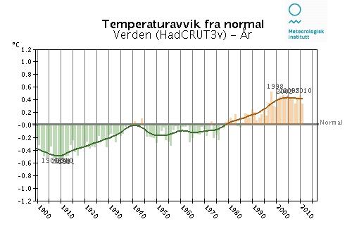 Det er interessant å merke seg at det var en kald periode frem til 1930 og så en varm periode 1930- 1950 med unntak for tre av krigsårene. Så registrerer vi at det har vært en kaldere periode fra 1950 til om lag 1980 og deretter etterfulgt av en varm periode. Med andre ord har det vært en naturlig variasjon med veksling av kalde og varme perioder i Norge. Samtidig ser vi en trend hvor temperaturen i tillegg øker. Denne trenden er jevnt stigende fra den lille istiden som ble avsluttet noe senere enn 1850. Denne utviklingen med veksling av relativt kalde og varme perioder vises også på figur 2 som viser temperaturutviklingen for hele verden.