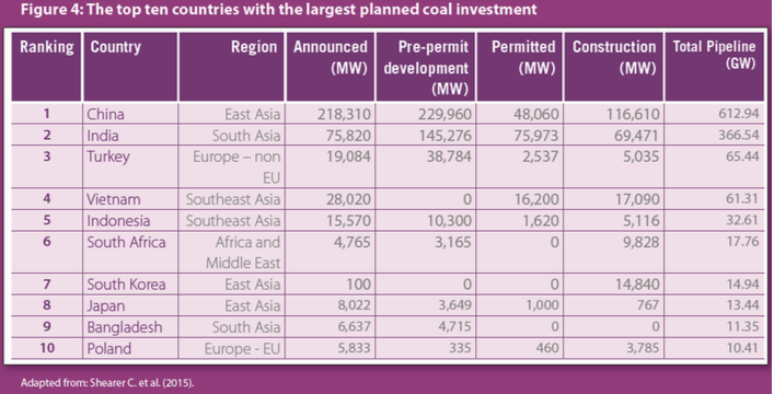 Vi bringer i dag listen over de ti største kullsatsende landene, figuren til venstre (fra Shearer C et al via HEAL) viser hvilket stadium i utviklingen planlegningen befinner seg på. Felles for de 10 landene er en sterk utbygging av kapasiteten med tilhørende økte CO2-utslipp. Av de 10 landene befinner 7 seg i Asia mens 1 er i Afrika, og ingen av de 8 kommer til å begrense utslipp av CO2 i nær fremtid.