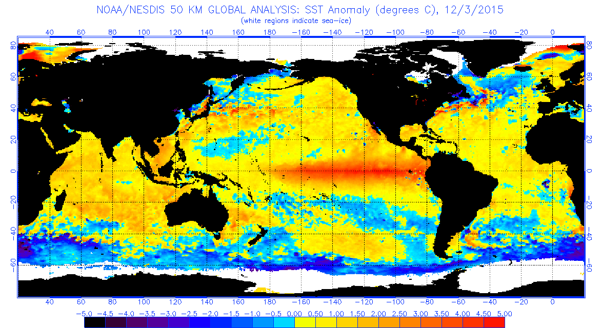 Store mengder vanndamp tar med seg energien oppover i atmosfæren. Energien forlater nå vår planet. NOAA sender hver måned ut lekre illustrasjoner som viser hvor mye varmere eller kaldere enn normalt det er regionalt på havets overflate. Figuren her er fra den varmeste delen av El Nino i midten av desember, blå farge indikerer nedkjøling mens varme farger er varmere enn normalen for måneden.