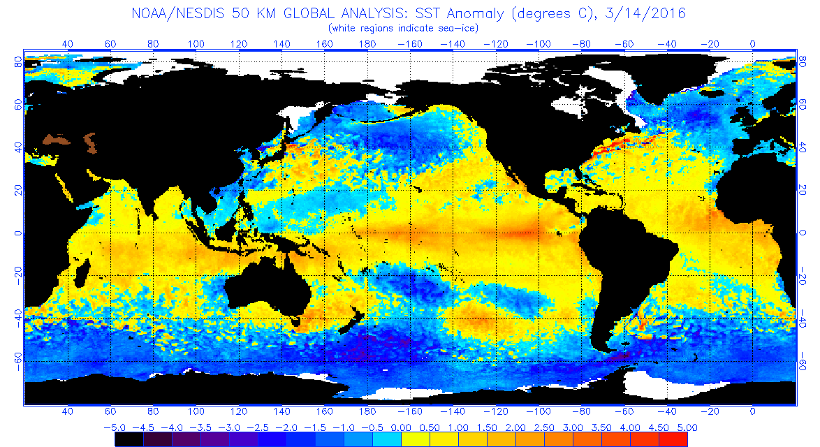anomnight.12.3.2015og denne figuren (under) er fra midten av mars etter tre måneders nedtur, blå farge indikerer nedkjøling mens varme farger er varmere enn normalen for måneden. Som man ser er havet – hvor nesten all energien i klimasystemet befinner seg – blitt betydelig kjøligere på overflaten de siste tre månedene.