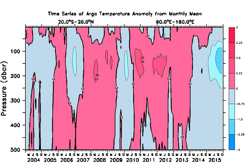 anomnight.3.14.2016For ordens skyld, la oss ta en titt på de dypere delene av havet i det relevante området nord for Australia (IPWP – Indo-Pacific Warm Pool), det er der denne energien fraktes. Neste figur (ARGO Global Marine Atlas – kilde Die Kalte Sonne) viser avvik i temperaturen ned til 500 meters dyp for årene 2004 til 2014, hvor rødlig farge er varmere vann i år med La Nina og blålig er kjøligere vann i år med El Nino.